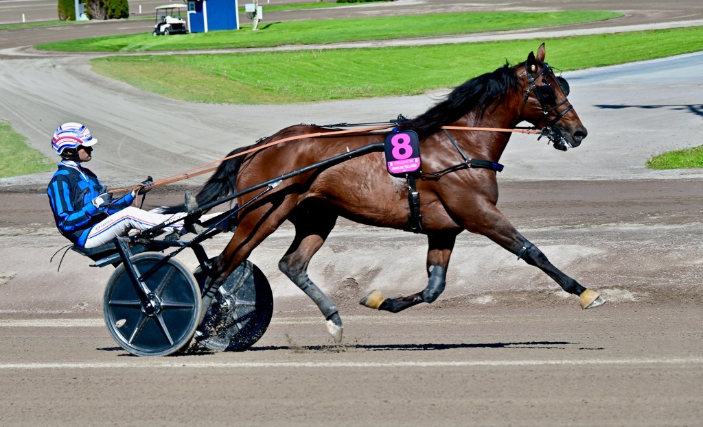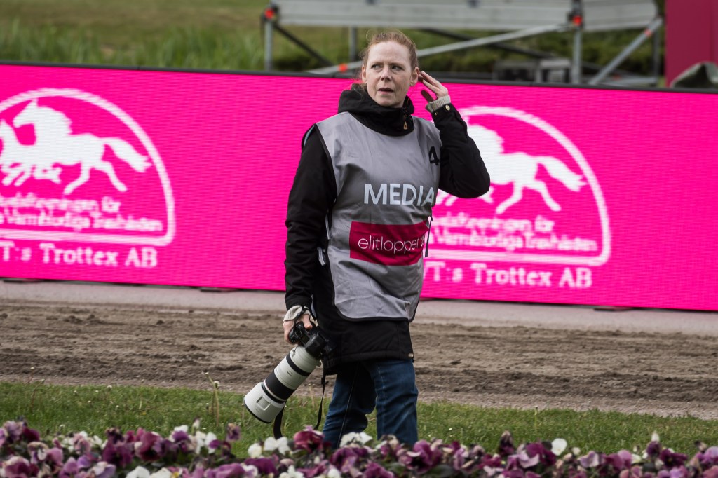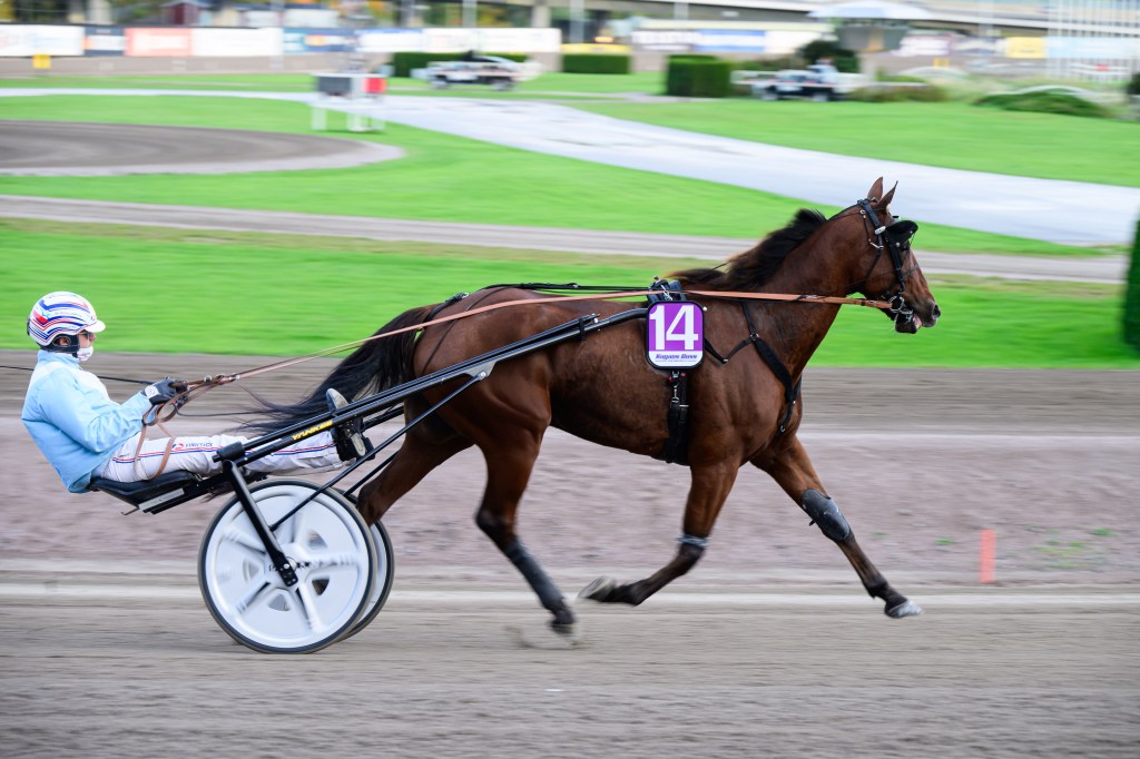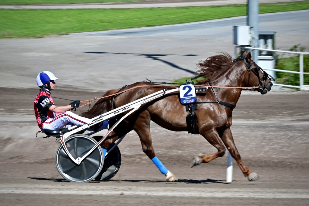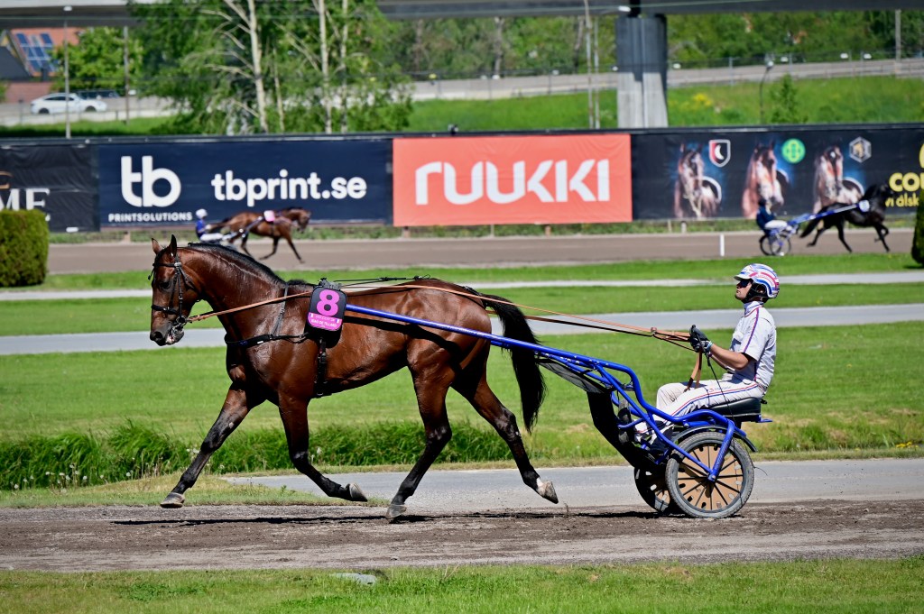 Jag springer ner och hinner med målgången. Det är ett jämt lopp, många med chans. Tidigt har Richard Skoglund bakom 3 BONSSE GARDE tagit ledningen. Han verkar rinna ifrån till säker seger. Men icke. Magnus A Djuse har tagit upp jakten med 8 MODER TERESA SISU. Vinnare nummer åtta Moder Teresa Sisu!