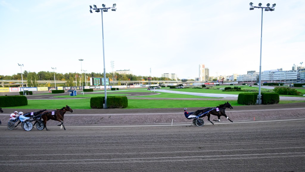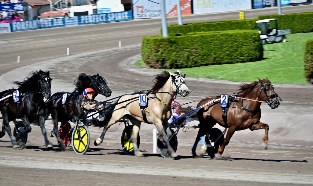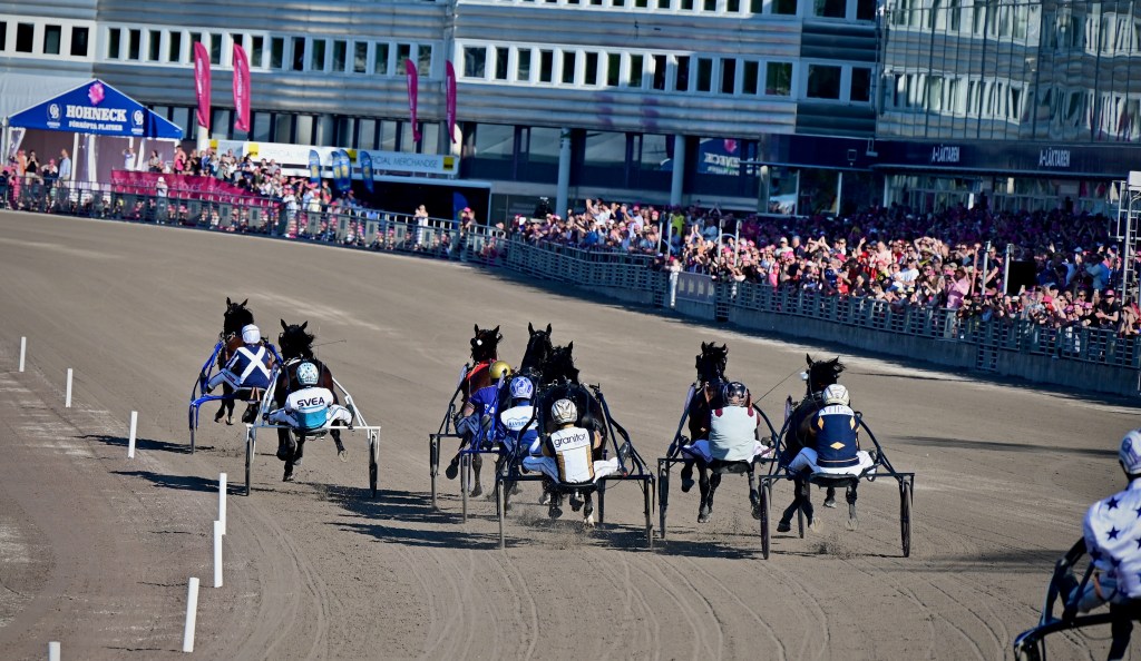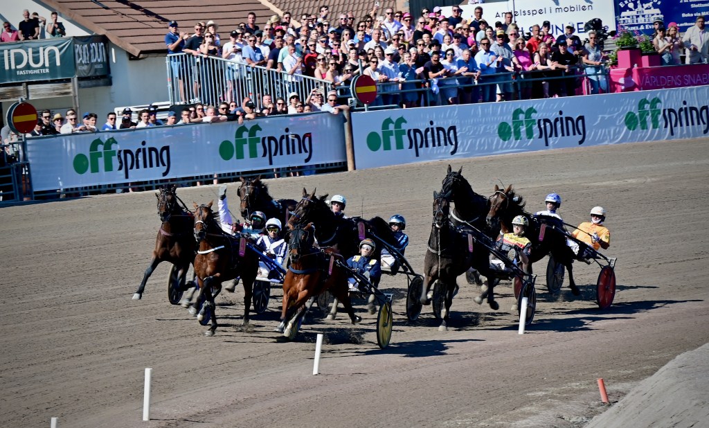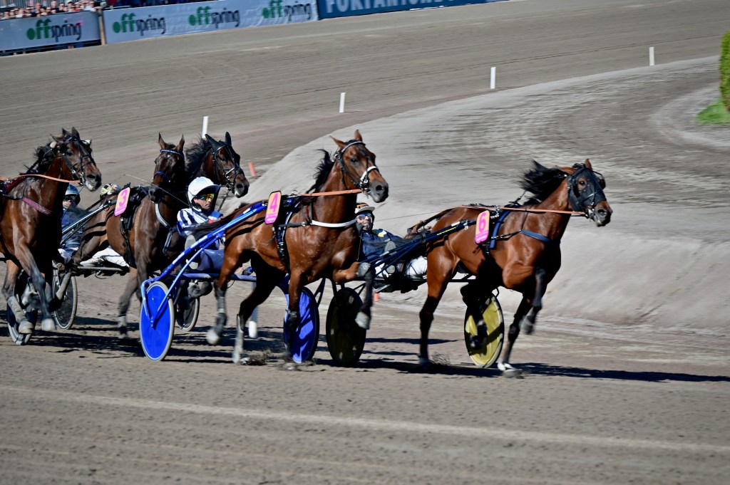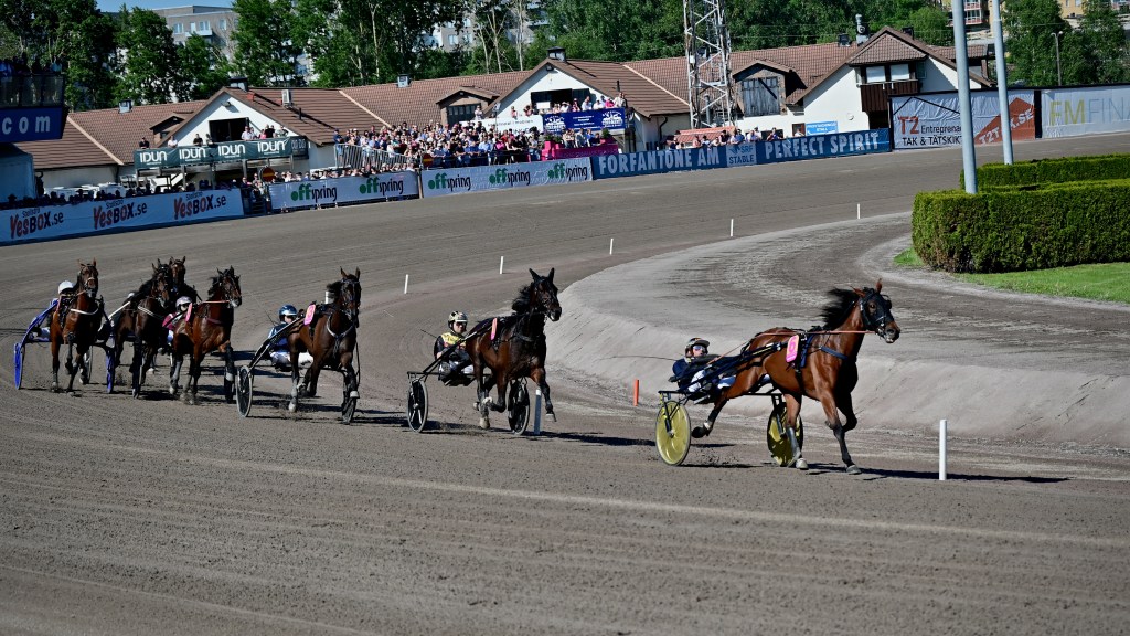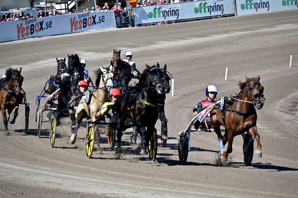 Starten går. Wäjersten blixtrar till ledningen. Hästarna varvar. Wäjersten kollar bakåt. Hästarna varvar en gång till. Wäjersten kollar bakåt.