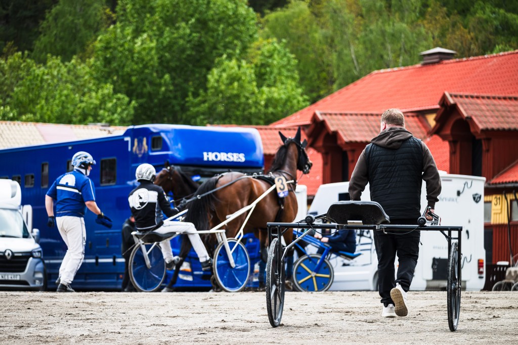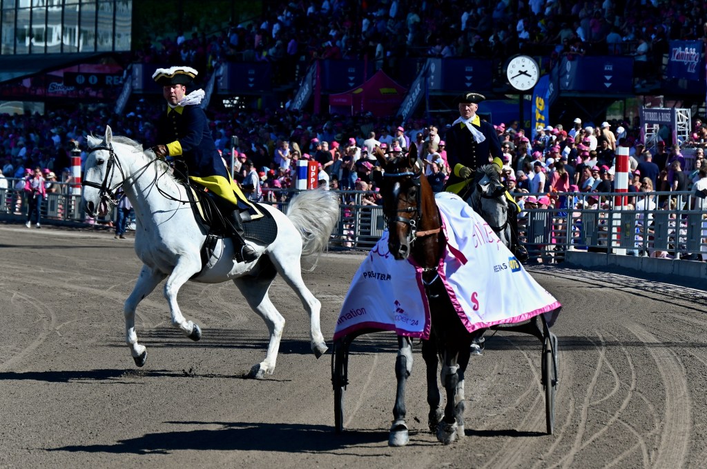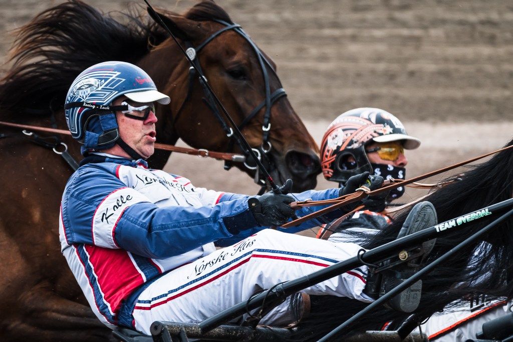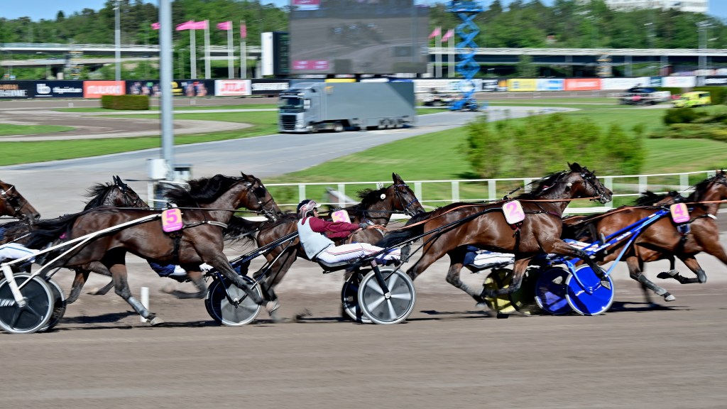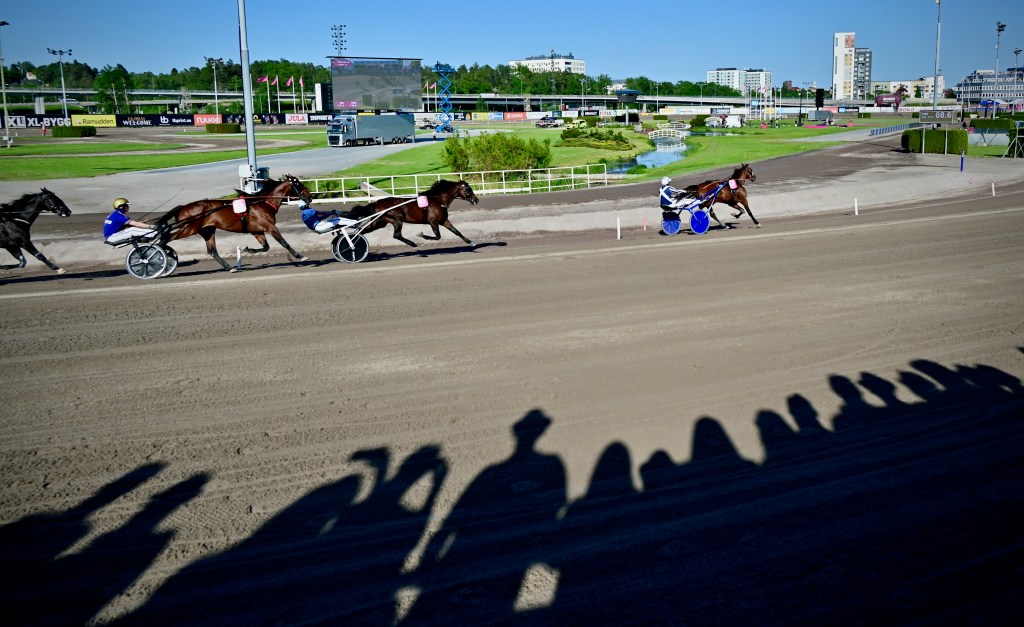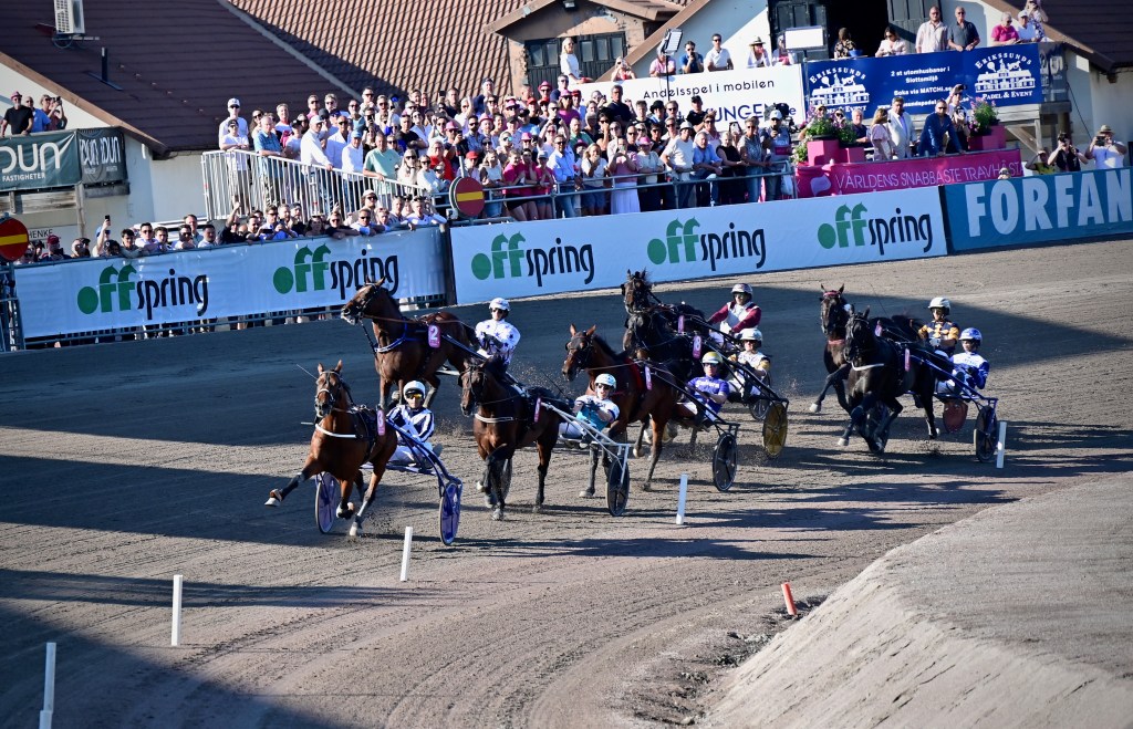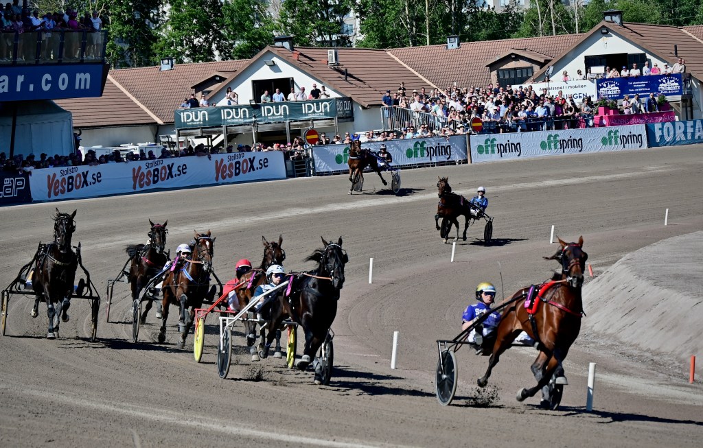 Starten går. Wäjersten blixtrar till ledningen. Hästarna varvar. Wäjersten kollar bakåt. Hästarna varvar en gång till. Wäjersten kollar bakåt.